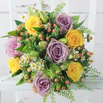 Will my flowers look like the picture? We send the lilies in bud, and the lavender and yellow roses semi-bloomed. This helps to protect the delicate flowers in transit and means your bouquet will need a day or two in water to fully bloom and look like the picture.