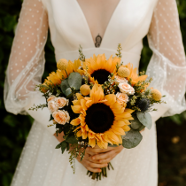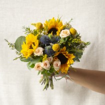 Bridesmaid Bouquet: x3 Sunflower, x1 Blue Thistle, x3 Solidaster, x3 White Waxflower, x3 Crespedia, x3 Eucalyptus, x3 Yellow Spray Rose