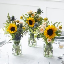 Jars: x3 Sunflower, x2 Blue Thistle, x3 Solidaster, x2 White Waxflower, x6 Crespedia, x2 Eucalyptus, x3 Hard Ruscus, x3 Yellow Spray Rose, x3 Jars. All Flowers Are Split Between 3 Jars