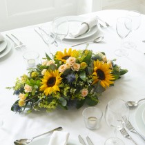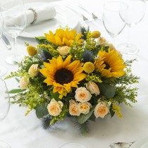 Long n Low: x3 Sunflower, x2 Blue Thistle, x4 Solidaster, x3 White Waxflower, x5 Crespedia, x3 Eucalyptus, x3 Hard Ruscus, x4 Yellow Spray Rose