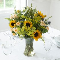 Vase: x3 Sunflower, x2 Blue Thistle, x3 Solidaster, x2 White Waxflower, x4 Crespedia, x3 Eucalyptus, x3 Hard Ruscus, x3 Yellow Spray Rose, Nigella Vase