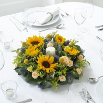 Wreath: x5 Sunflower, x2 Blue Thistle, x4 Solidaster, x2 White Waxflower, x5 Crespedia, x3 Eucalyptus, x3 Hard Ruscus, x3 Yellow Spray Rose, Wreath Frame and Storm Vase and Candle