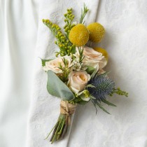 Buttonhole: x0.3 Blue Thistle, x0.3 Solidaster, x0.3 White Waxflower, x1 Crespedia, x0.3 Eucalyptus, x0.5 Yellow Spray Rose